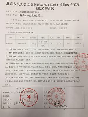 ? ? 東升地毯第一次參與人民大會(huì)堂內(nèi)部地毯項(xiàng)目是在2016年的7月份,通過公開招標(biāo)我公司一舉中標(biāo),該地毯主要用于人民大會(huì)堂內(nèi)部歷年的兩會(huì)和大會(huì)堂內(nèi)部的重要活動(dòng)、會(huì)議地面的鋪設(shè)使用(多次重復(fù)使用),中標(biāo)后簽訂第一批供貨合同5000平米,17年12月份緊急追加簽訂合同5000平米,18年7月份簽訂合同1200平米,18年11月簽訂合同2000平米。