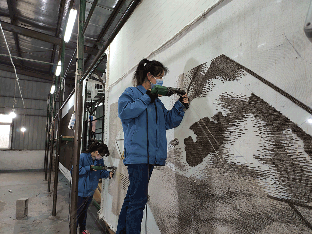 ? ? ? 手工槍刺地毯多以純羊毛和真絲為材料,前后經(jīng)過圖案設(shè)計、配色、染紗、掛布、手工槍刺、涂膠、掛底布、平毯、片毯、洗毯、回平、修整等十幾道工序加工制作而成。經(jīng)手動將地毯絨頭紗人工植入特制的胎布上,將各種色線組合成精美圖案。然后在毯背涂刷膠水,再附上底布,手工包邊而成。圖案色彩也可以達(dá)十幾二十種;